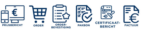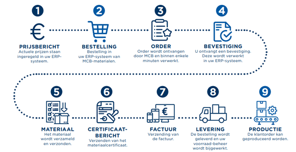 Our EDI process starts with preparing a digital price list. Our customers can process this in their own ERP system, providing 24/7 access to our current article prices. Upon receiving the digital order, it is immediately prepared in our warehouse, and you receive the order confirmation. On the delivery day, the digital packing list and material certificate are sent, followed by the invoice after receiving the goods. We assist in setting up data such as article numbers, article relations to MCB articles, prices, and contact details. The entire EDI process is illustrated below.