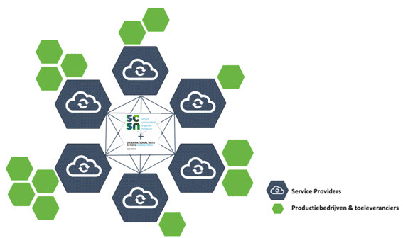 The SCSN network is a network of networks in which all service providers/brokers are connected to each other. This enables every manufacturing company to communicate with all other. Unlike EDI connections, there is no need to establish a connection with each company individually.