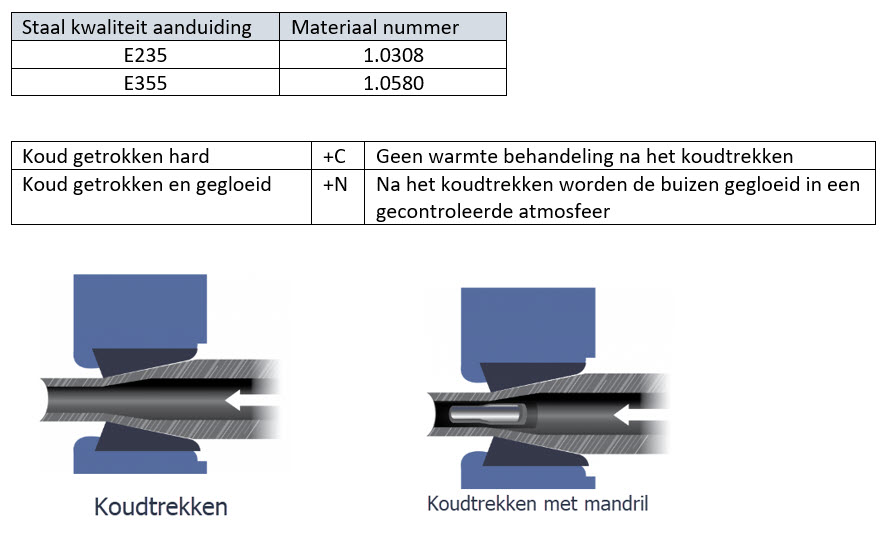 De meest voorkomende materiaalkwaliteiten voor naadloze koudgewalste precisie buizen zijn E235 en E355. In de tabel hieronder is de materiaalaanduiding volgens EN 10305-1 weergegeven. Het materiaal E235 (St. 37.4) is een koolstofstaal dat gemakkelijk te lassen én te bewerken is. Door de warmtebehandeling zijn de buizen koud te vormen (bijvoorbeeld om te buigen en te optrompen).